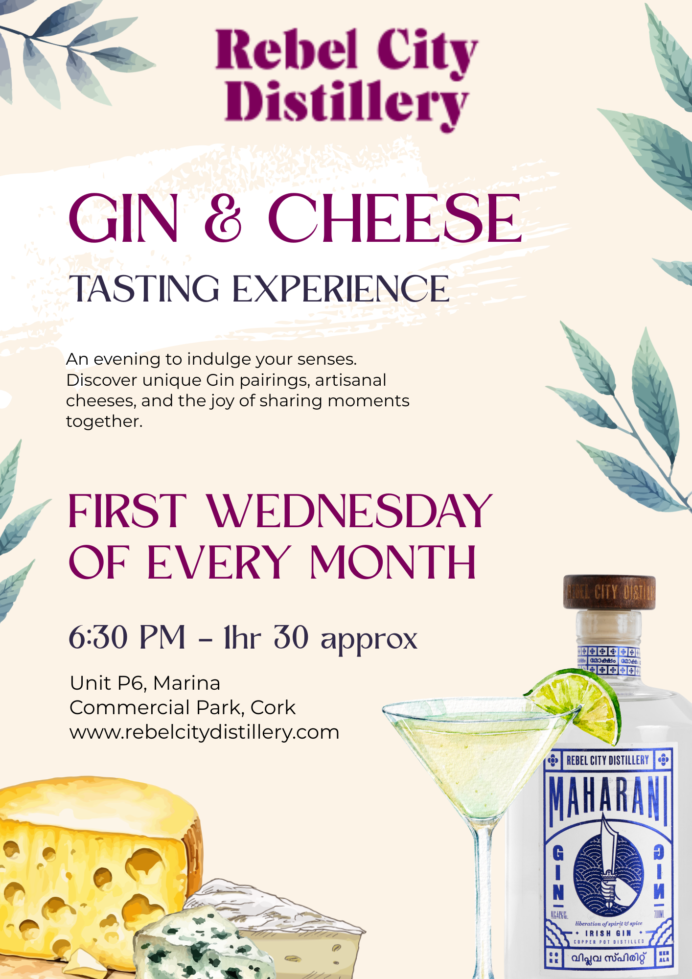 Join us at Rebel City Distillery for a relaxed Gin and Cheese Tasting Experience in the heart of Cork’s docklands. We will guide you through a tasting of Maharani Gin paired with a curated selection of high quality local artisan cheeses, with Spanish gildas and extra bites designed to bring out the best in every flavour.